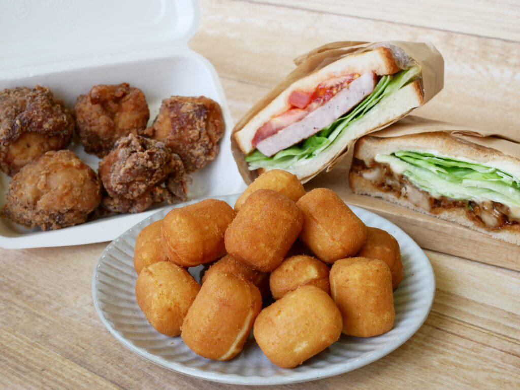 ジューシーなふかがわポークのソーセージステーキを使用した「SLTサンド」はピリッと辛いからしマヨネーズがアクセント。大人もお子様も大好きな米粉100%のベビーカステラはドライブのお供にもぴったり。