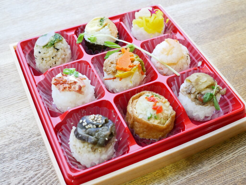 手土産やお弁当、木箱のお祝いごとや贈りものにもオススメなひとくちお結び。週末には彩りあざやかなおはぎもお作りしています。