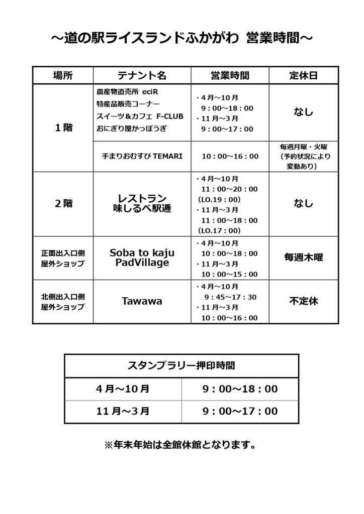 令和8年4月より、営業時間が変更となります。ご来館の際は、各店舗の営業時間・定休日を下記画像にてご確認ください。